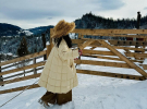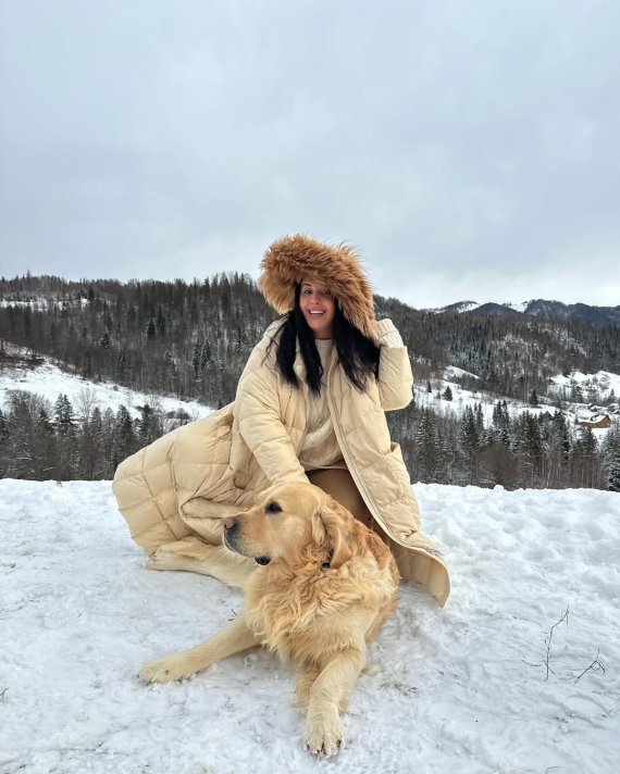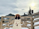 Перед камерою постала в кремовому пуховику, широких штанах і черевиках.