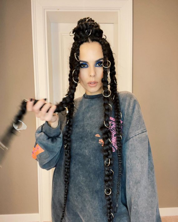 На серії знімків, опублікованих в Instagram, зірка постала з довгими косами, стилізованими під дреди та прикрашеними кільцями. Образ доповнила яскравим макіяжем.