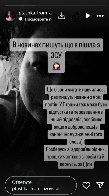"У новинах пишуть, що я пішла із ЗСУ. Ще б вони читати навчилися, раз пишуть новини з моїх постів. У "Пташки" теж може бути відпустка і переведення в інший підрозділ, особливо якщо я доброволець (у канонічному значенні цього слова). Розберусь зі здоров'ям рідних, трішки частково зі своїм та й вернуся. Заї**ли", - написала Поліщук.