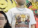 Перед камерою чоловік постав у бомбері та футболці одеського бренду Bulletproof Gang. На вбранні зображений затоплений Кремль з атомним вибухом.