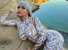 На фото, опублікованих в Instagram, зірка позувала оголеною. Інтимні місця замалювала білою фарбою. Образ доповнила срібними прикрасами і перукою зі стразами.