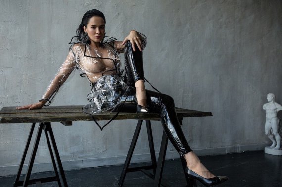 Артистка приміряла прозорий плащ на голий верх. На ногах мала латексні штани. Автором зйомки була Анна Фатєєва, яка вже знімала знаменитість.