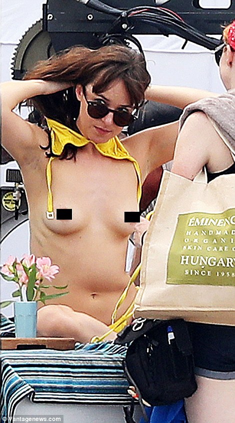 Зірка "50 відтінків сірого" Дакота Джонсон була помічена на зйомках продовження картини. Акторка засмагала топлес на пляжі в оточенні знімальної групи та колеги за фільмом, Джеймі Дорнана.