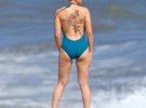 Для відпочинку Скарлетт обрала блакитний суцільний купальник та синю кепку.