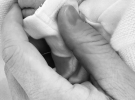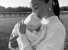 Перед камерою зіркове подружжя постало в світлих светрах. Хлопчика закутали в іменну ковдру та одягли в'язану шапку.
