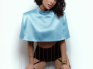 Перед камерою постала в блакитному топі-накидці, чорних трусах, панчохах з поясом і високих чоботах.
