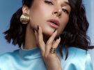 Образ доповнила масивними золотими прикрасами, локонами та ніжним макіяжем.
