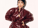Образ доповнила зібраним волоссям, контрастним макіяжем і масивними золотими прикрасами.