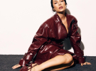 Одягла костюм трендового відтінку бургунді, який складається з подовженої спідниці та жакета.