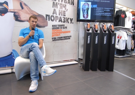 Вперше після перелому щелепи Андрій Шевченко вийшов у люди без спеціальної захисної маски. Капітан збірної України презентував нові бутси фірми, яку рекламує.