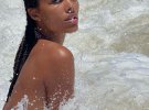На іншому фото модель прогулюється берегом й повернута спиною до камери. З одягу на дівчині лише мікротрусики, оголені груди прикрила руками.