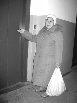 — Та апаратура в ліфту, що вкрали, мабуть, на десятому етажі була. Я убираю в під"їзді, ліфт працював майже постійно. Тепер плохо. Довелося вчора прибрати з першого по шостий поверх. А сьогодні буду вищу половину. У мене серце больне й ішемія, раз у день вийду по східцях і то серце болить. А раніше коли схотіла, тоді й спустилася. Недавно давлєніє піднялося, викликали скору. Син униз спустився, щоб зустріти, бо поночі. А вони питають, куди ви нас ведете. Бо в нас переходи з поверха на поверх через балкони.