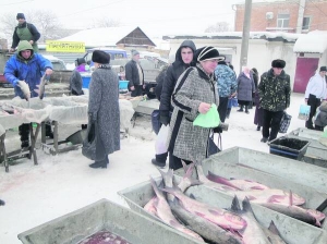 — Усе самі тут робимо, прилавки самі лаштуємо, сніг посипаємо, щоб людям і нам не слизько, — каже Інна. — Рибу треба доставати з-під льоду, стоїмо тут, поки спродаємося, замерз не замерз — нікуди не втічеш. Приїжджаємо зранку, щоб зайняти місце. Літом у п'ять ранку вже тут, зараз пізніше, бо холодно, люди купляти йдуть пізніше. На велику сім'ю беруть багато риби, з товстолоба роблять холодець, котлети. Коропа жарять.
