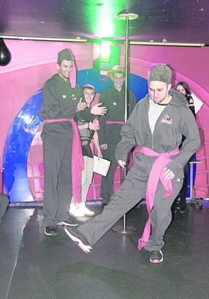 Усі за столиком сміються. У цей час Міні зав'язують очі, щоб вона визначила, де стоїть Марко, торкаючись лише біцепса.