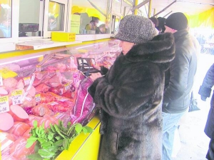 — Дєвочка, а "Царська" у вас мягка? — запитує Анатолій Мельников, 79 років. — Купую тільки її, бо запах сильно нравиться. При совєцькій власті була добра "Черкаська", яку робили на місцевому м'ясокомбінаті. Раніше "Московська" була одного сорту, а зараз як взнати — де хороша? Подивіться на ціни, — підходить ближче до вітрини, щоб прочитати цінники на "Московській" ковбасі. — 102, 126, 96, 61 гривня, а на вид вся однакова.