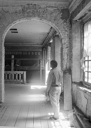 Піднімаємося на другий поверх. Навпроти сходів напис фарбою на стіні: "Политбюро ЦК КПСС". Зберігся з часів будівельного технікуму. На другому поверсі всюди настелена нова підлога.