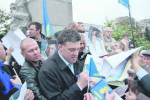 — Для олігархів ми підготували проект закону про примусове повернення коштів, — продовжує Олег Ярославович. — Ми скасуємо несправедливу пенсійну реформу Тігіпка. Адже зараз можновладці отримують по 30, 50, 80 тисяч пенсії, а бабці в селах — ледве по тисячі. Ми запровадимо не більш, ніж п'ятикратний розрив між мінімальною та максимальною пенсіями. Обов'язково подовжимо мораторій на продаж української землі. Бо вже зараз арабський, китайський і російський капітали лише чекають 1 січня, аби захапати наші землі. Ми маємо зберегти українську землю нашим нащадкам. Так само маємо зберегти і мову. Уже зараз у багатьох селах Закарпаття та Буковини над сільрадами висять румунські й угорські прапори, бо ці села перейшли на відповідні регіональні мови. Конференцію вчителів у Берегівському районі Закарпаття провели угорською. Запровадження закону про мови — справа Москви. Вона не змогла розвалити нас економічно, то пробує зробити це через внутрішні чвари. Для інших мов є Росія, Угорщина і Румунія. А іншої України в нас немає. Тому майбутні вибори для нас — чорно-білі. Або демократія, або банда, — підсумовує лідер націоналістів.