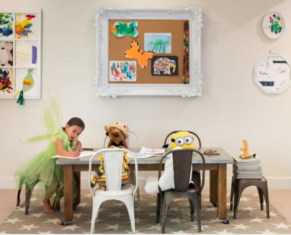 На стіні висить дошка для малюнків, зроблена зі старого дзеркала. Крім дзеркала, дизайнер використала старовинне вікно. Воно перетворилося на ще одну виставкову дошку для малюнків маленької господині кімнати.
