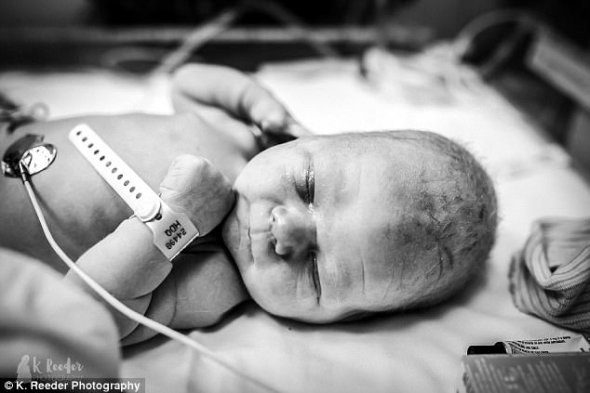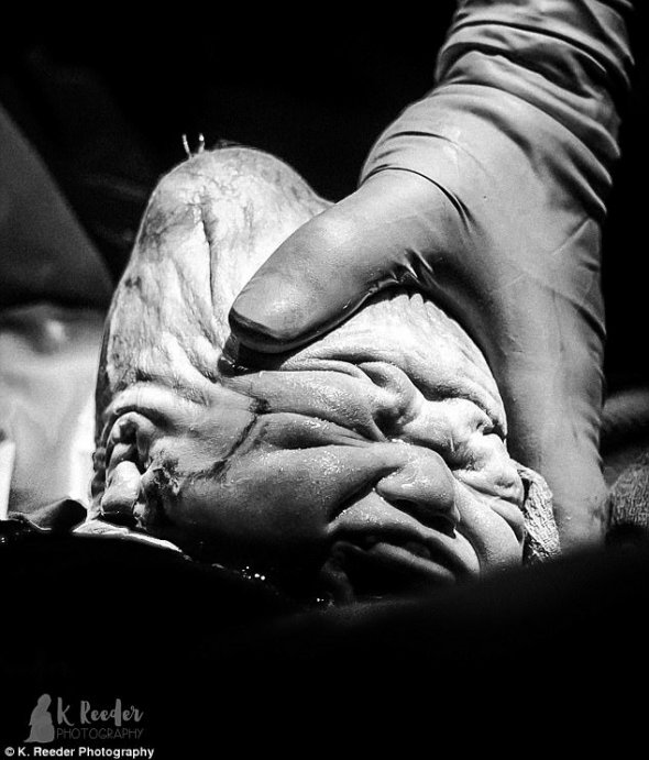 "В утробі він злегка нахилив голову, тому його мамі довелося тужитися і проштовхувати його трохи довше, ніж при нормальному положенні плоду", - розповіла Кайла.