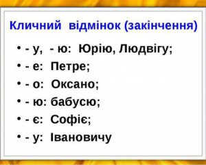 У звертаннях, які складаються з загальної назви та ім'я: брате Петре, тітко Марфо, колего Іване. А якщо до звертань входять ім'я ще й по батькові, то форму цього відмінка мають обидва компоненти: Володимире Петровичу, Надіє Гордіївно, Велимире Кузьмичу (або Кузьмовичу), Світлано Ярославівно. У звертаннях, де є загальна назва і прізвище, у формі кл. відмінка виступає перше слово, а 2-е – в називному: товаришу Іваненко, депутате Климчук, кореспонденте Пилипів. Коли ж у звертанні лише загальні назви, то їх обох слід подавати у кличному відмінку: пане офіцере, добродію ювіляре.