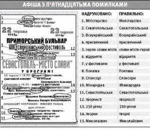 На Приморському бульварі в Севастополі відбувся фестиваль до 230-річчя заснування міста. В україномовній афіші, що інформувала про захід, було стільки помилок, що її фото розмістили в інтернеті. Більшість помилок хтось повиправляв ручкою, а наприкінці вивів оцінку — "2". Серед організаторів фестивалю — Міністерство освіти і науки й Товариство "Просвіта" ім. Тараса Шевченка.