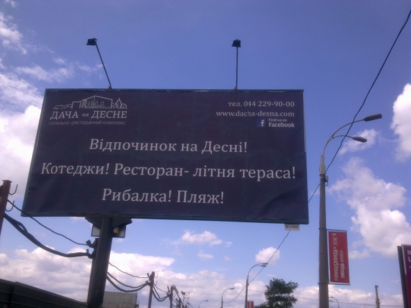 Така кількість знаків оклику збуджує й викликає еротичну мрію: поїхати на Десну, зустріти там крутого рибалку (авжеж, не про риболовлю йдеться) і – в "номєра", чи то пак у "котеджи"! Власникам готельно-ресторанного комплексу, напевно, здалося, що правильно написане слово "котеджі" виглядатиме не "сексі". Та й із рестораном якось перемудрили. Отой дефіс (чи тире?) має означати одне з двох: або ресторан має терасу, або ж літню терасу в комплексі обладнано під ресторан. А що саме? Тож ми краще на "Пляж!", щоб не було розчарувань.