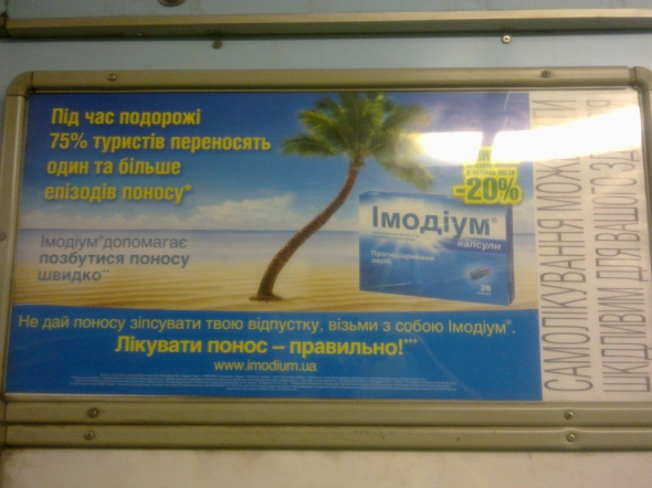Як страшно жити! 75% туристів "переносять один та більше епізодів поносу"! Все, відтепер ніякого туризму. Читатимемо книжки не на пляжі, а вдома. Наприклад, словники, які, за висловом класика, "пишний сад, а не сумне провалля". В українській мові слів, які означають розлад шлунка, про який ідеться в рекламі, якраз "пишний сад". Бігучка, біганка, побігачка, побігуха, будишниця, утрібка, свистуха, різачка, почеревиця, тискавиця… Є навіть образне "швидка Настя". Звісно, все це не для реклами. Але хоча б по-літературному "пронос" можна було написати?