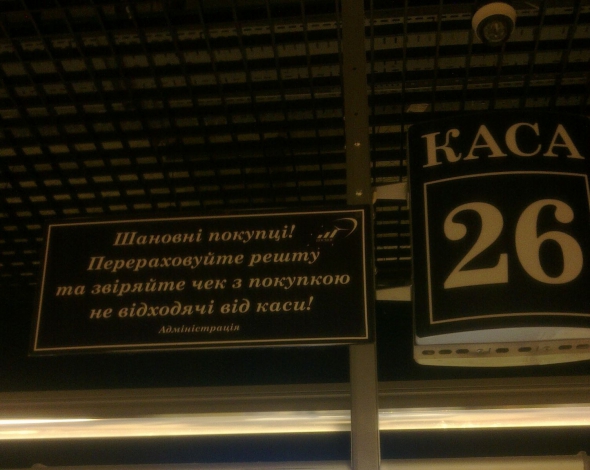 Ви не на коми дивіться, а "щитайтє мєлочь". І то "не відходячі від каси"! Звісно, коли йдеться про такі серйозні речі, як "перераховування решти" та "звіряння чека з покупкою", не до граматики.