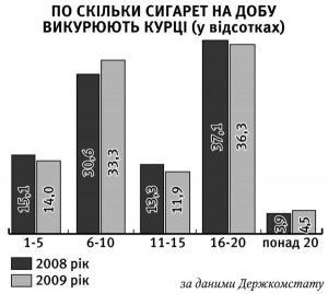 Державний комітет статистики підрахував, що третина курців випалюють на добу майже пачку цигарок. Між тим, українці поступово відмовляються від куріння, вважає 52-річний Костянтин Красовський, керівник відділу контролю над тютюном Українського інституту стратегічних досліджень Мінохорони здоров"я. За останні п"ять років кількість жінок, які щоденно палять, зменшилася з 17 до 7%, а чоловіків — із 62 до 47%.