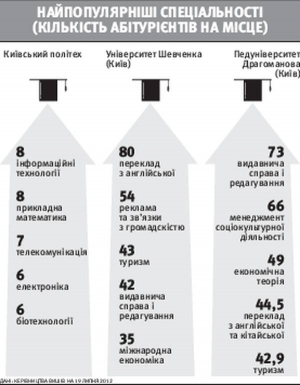 — Рекламі університету в газеті чи по радіо довіряють тільки 10 відсотків абітурієнтів, — розповідає перший проректор столичного Педагогічного університету ім. Драгоманова Володимир Бех, 61 рік. — 70 відсотків — покладаються на спілкування з успішними випускниками і студентами. Саме соціальний статус і авторитет випускників створює імідж вузу. Університет Шевченка — це елітний навчальний заклад. Це МГУ, Оксфорд. КПІ — мало не єдиний вуз, який обслуговував науково-технічний прогрес. Там сформувалися особливі спеціальності. І коли діти мріють про космос, авіацію, нанотехнології — мріють про КПІ. Деякі університети, визнані найкращими, не мають такої популярності серед абітурієнтів. Це тому, що вони мають дуже високі вимоги до вступників, тобто ставлять "фільтр" на вході. Наприклад Києво-Могилянська академія висуває жорсткі вимоги щодо знання англійської. І це правильно. До них ідуть ті, хто впевнений у своїх силах. Бо навчатися англійською дуже складно.