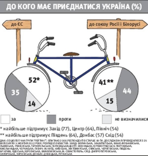 Ми ставили уточнювальне запитання: що ви більше підтримаєте — вступ до зони вільної торгівлі з Євросоюзом чи вступ до Митного союзу? Тут ми бачимо невелику перевагу європейського вибору: 40 відсотків громадян України підтримують підписання угоди з Євросоюзом. Трохи менше — 37 відсотків — за Митний союз. Це уточнення в дечому підтвердило європейський вибір більшості українців.