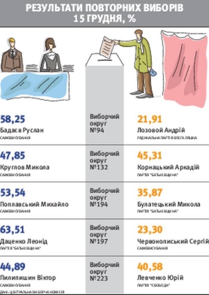 15 грудня у п'яти округах пройшли повторні вибори до Верховної Ради. Лише в Черкаській області народним депутатом обрали опозиціонера — Леоніда Даценка з "Батьківщини". У чотирьох інших перемогли представники влади. На Київщині — Руслан Бадаєв, Миколаївщині — Микола Круглов, у Черкасах — Михайло Поплавський, у столиці — Віктор Пилипишин.