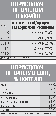 — Кількість людей, що користуються інтернетом в Україні, зростає на 25-30 відсотків щороку, — каже засновник інтернет-видання "Вотчер" 34-річний Максим Саваневський. — Це відбувається переважно за рахунок залучення людей пенсійного та передпенсійного віку, а також жителів міст із населенням менш як 100 тисяч. У великих містах, хто хотів собі інтернет, уже давно його має. Також зростання аудиторії відбувається за рахунок долучення до мережі нових поколінь людей — 14-16-річних.