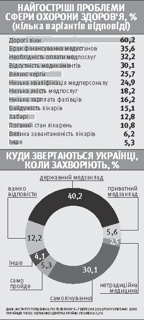 Головними проблемами сфери охорони здоров'я українці вважають брак грошей на медпрепарати, фінансування медзакладів і медпослуг. Про це свідчать результати опитування, яке місяць тому провів Інститут Горшеніна.