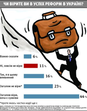 60% українців вірять в успіх реформ. 59% — готові заради цього терпіти матеріальні труднощі. Про це свідчить опитування фонду "Демократичні ініціативи" ім. Ілька Кучеріва та Центру Разумкова. 34% не вірять у реформи, але 23% із них — все ж мають певну надію. І лише 11% переконані в негативному результаті.