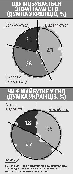 Країни-учасниці Співдружності незалежних держав віддаляються одна від одної. Так вважають 43% українців. Їх опитала компанія "Ресерч енд Брендинґ Ґруп". У грудні минає 20 років з часу створення СНД, у якій Україна є спостерігачем. Майбутнього для цього господарського, політичного та економічного об'єднання республік колишнього Радянського Союзу не бачать 47% опитаних.