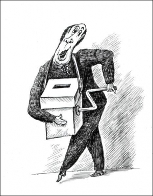 Якогось хворого діда приводять під руки, садять у крісло і кладуть перед ним бюлетень. Потім довго пояснюють, що дідові треба поставити галочку в будь-якому квадратику. Докладаючи героїчних зусиль, хворий робить помітку. Усі посміхаються — "акт демократичного волевиявлення" відбувся!