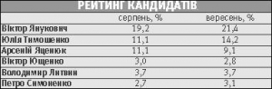Лідером перегонів поки що залишається головний "регіонал", за даними опитування. Порівняно із серпнем Янукович на 2,2% підвищив свій рейтинг, і тепер він становить 21,4%. Рейтинг прем"єр-міністра сьогодні 14,2%. Це на 3,1% більше, ніж у серпні. У Тимошенко — найвища динаміка приросту симпатій виборців.