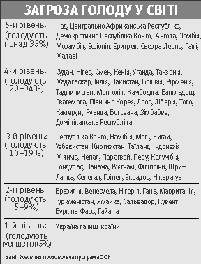 Україна потрапила в категорію країн, де голодують менш як 5%. Вітчизняні норми фізіологічних потреб у харчуванні затверджені 1999-го. Всесвітня організація охорони здоров'я радить переглядати їх кожні п'ять років.