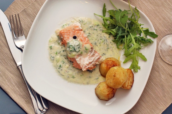 200 мл вершків 20-ти відсоткової жирності налийте в каструльку і поставте на невеликий вогонь. Додайте 1 чайну ложку білої гірчиці і 4 чайні ложки діжонської гірчиці, 2 чайні ложки меду, вичавіть сік четвертинки лайма чи лимона і розмішайте. Насіння гірчиці і коріандру прогрійте на сухій сковороді до потріскування і теж покладіть в соус. Коли він почне густіти, додайте дрібно нарізану зелень — кріп, петрушку і будь-яку іншу за смаком, і зніміть з вогню.
