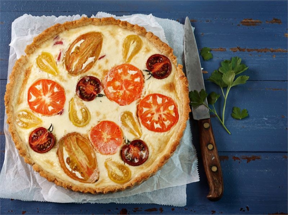 Розкласти зверху скибочки томатів. Краще брати жовті і червоні - так пиріг буде виглядати ефектніше). Злегка підсолити помідори.