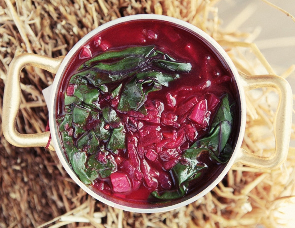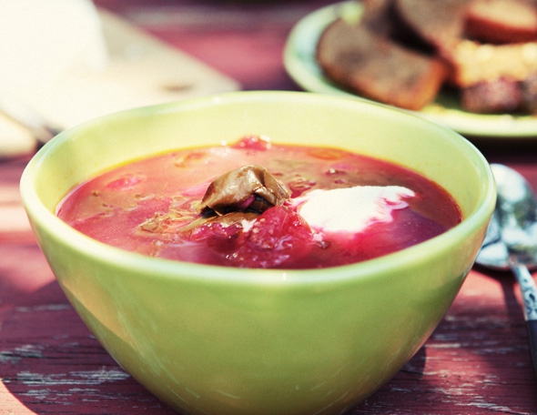 Коли на ринках з'являється буряк з бадиллям, можна зварити легкий варіант борщу зі свіжими пружними листям бадилля. На Кавказі їх зазвичай відправляють в пироги, а у нас варварськи викидають. Але з зелено-бордовими лопухами борщ стає дивовижним! Єдине, купуючи буряк навесні, будьте пильні - бульби у такого буряка старі, їх просто заново встромляють у землю, щоб вони дали пагони. Торішній буряк потрібно довше варити.