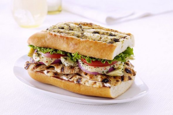 Для соусу айоли потрібно подрібнити часник і збити блендером з жовтками, лимонним соком і сіллю. Влити тонкою цівкою олію. Поставити на 1-2 години його в холодильник. Посолити куряче філе і підсмажити на грилі. Багет розрізати навпіл і змастити соусом айоли.