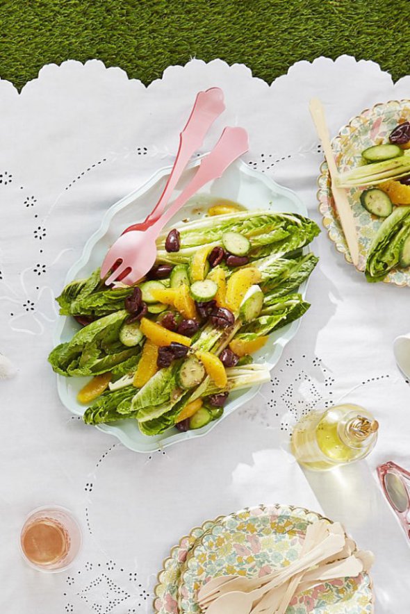 Зверху викласти порізані апельсини і оливки. Додати в салат ще можна свіжі огірки. Перед подачею полити салат заправкою і посипати насінням фенхеля.