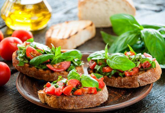 Порізати дрібно помідори і базилік. Додати оливкову олію і винний оцет, посолити за смаком. Ретельно перемішати. Накрити миску харчовою плівкою і дати настоятися 5 хвилин. Поверх золотистої скоринки хліба рівним шаром викласти помідорову начинку.