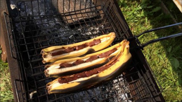 Загорнути їх у фольгу і обсмажити на решітці мангала 5 хвилин. Перед подачею банани можна посипати кокосовою стружкою або корицею.