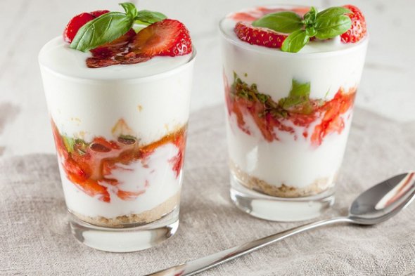 полуниця, грецький йогурт, м'ята, мед. Кількість залежить від форми посуду, в якій охолоджуватиметься десерт.