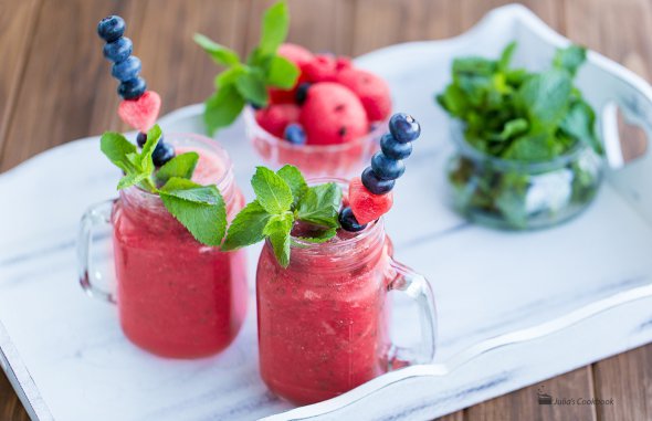 Охолодити всі продукти. Збити все в блендері. Прикрасити м'ятою.