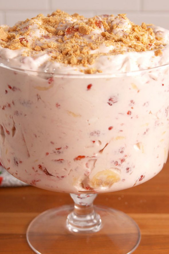 300 гр білого крем-сиру, пакетик ванільного цукру, 400 гр полуниці, 2 банани, печиво.