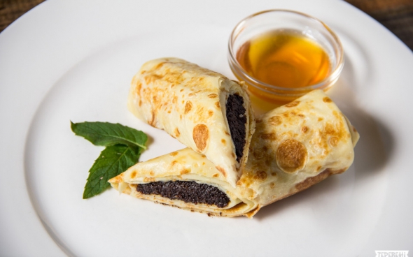 З одного боку на млинець рівномірно розподіляють макову начинку і загортають як рулет.